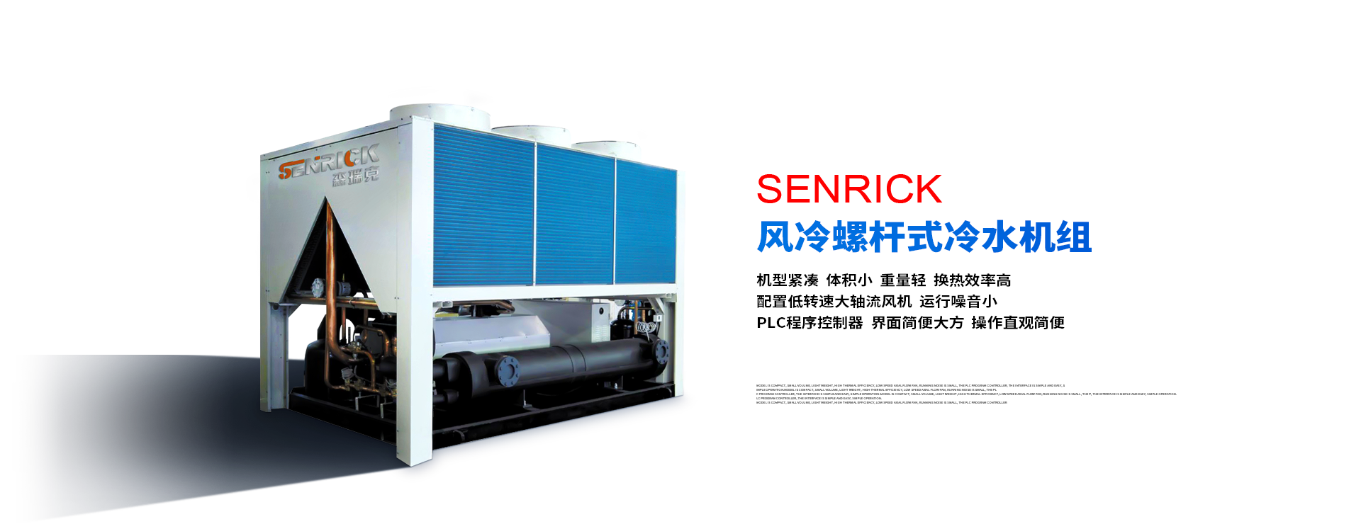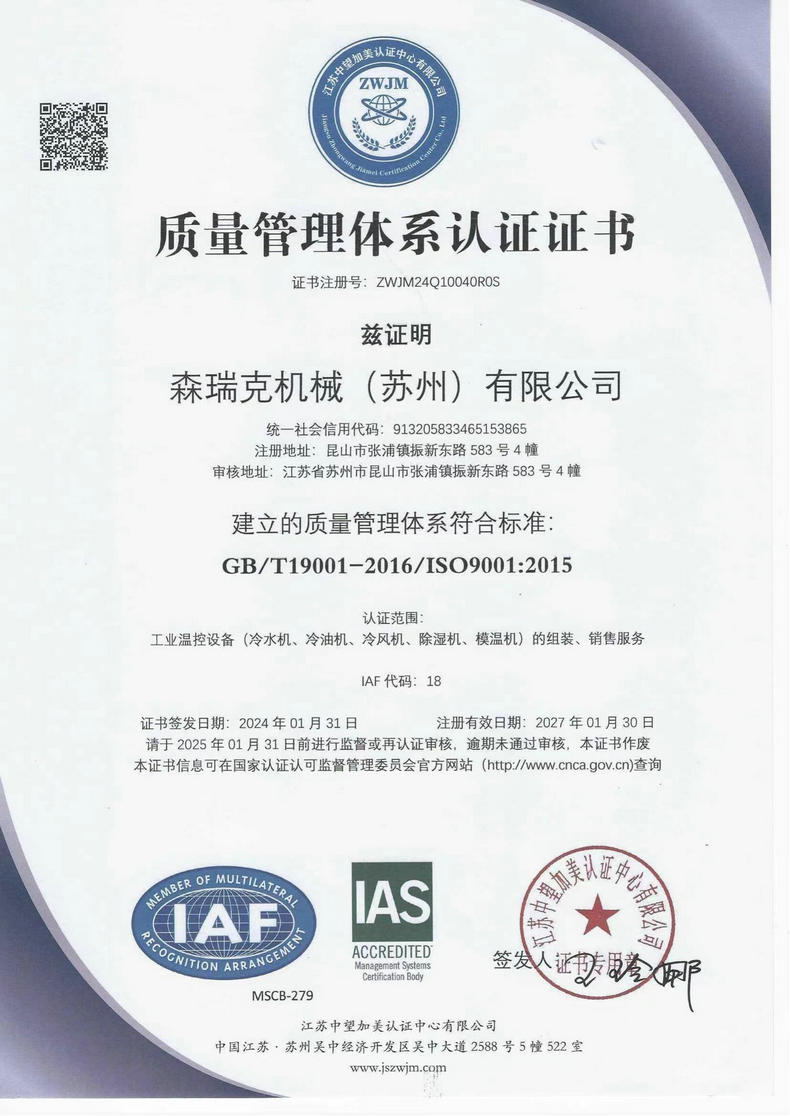 森瑞克機械(蘇州)有限公司(簡稱:SENRICK)是一家中外合作性企業,引進技術,專注于工業制冷設備,工業溫控設備,非標制冷設備,集激光,化工,真空設備輔機等集研發、生產、銷售、服務于一體的的現代化科技企業。公司擁有完善的制造設備,先進的檢測系統,獨立的加工、生產工藝,一支開拓創新專業有素的技術人才團隊,以及全面的質量控制體系,為產品質量的不斷優化提供了強大的保障,以確保滿足不同市場的各種需求。經過多年的努力企業相繼研發生產出了工業冷水機,工業冷風機,工業冷油機,工業機,低溫冷水機,低溫冷風機,低溫冷油機,螺桿式冷水機...